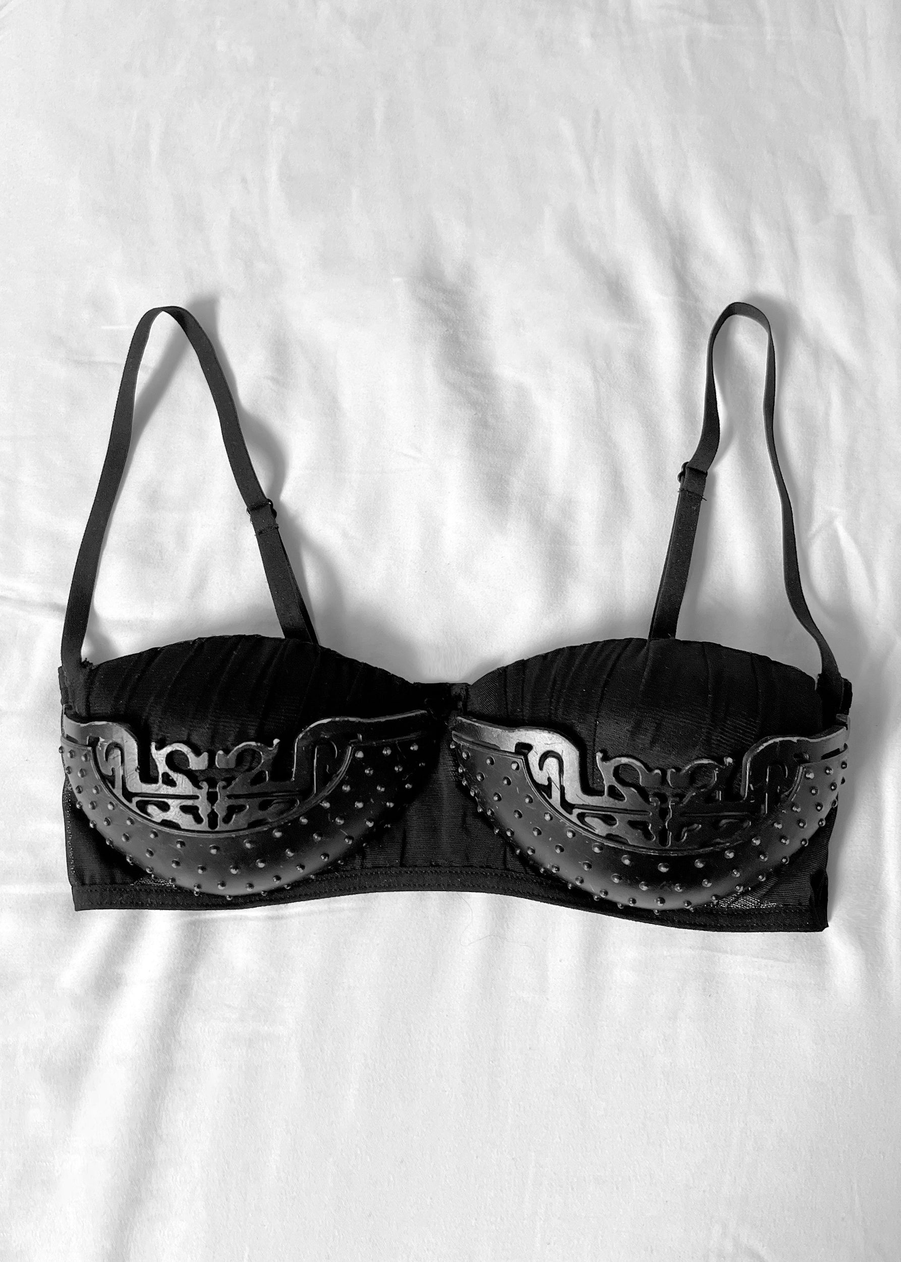 Carved Disc Bra with custom sculpted resin cups inspired by Zhou dynasty jade discs. Each piece is a labor of love with intricate engineering and detailing, hand stitching and hand pleated tulle.