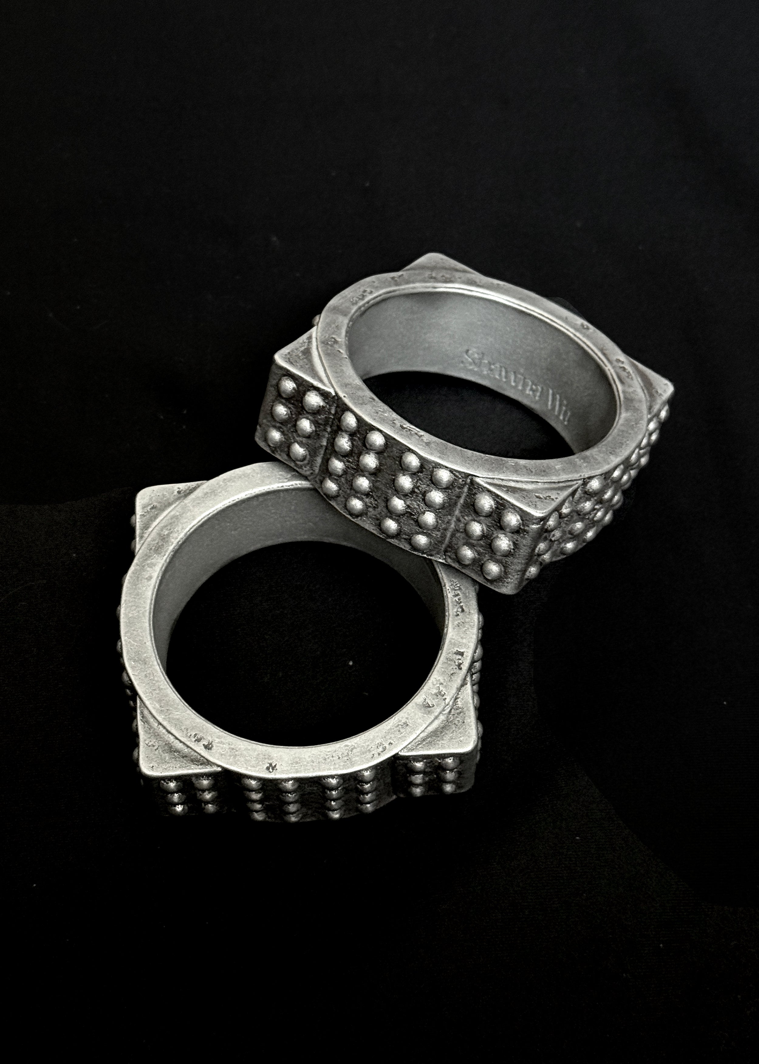 Finished with dark silver patina and made in aluminum for lighter ease of wear.