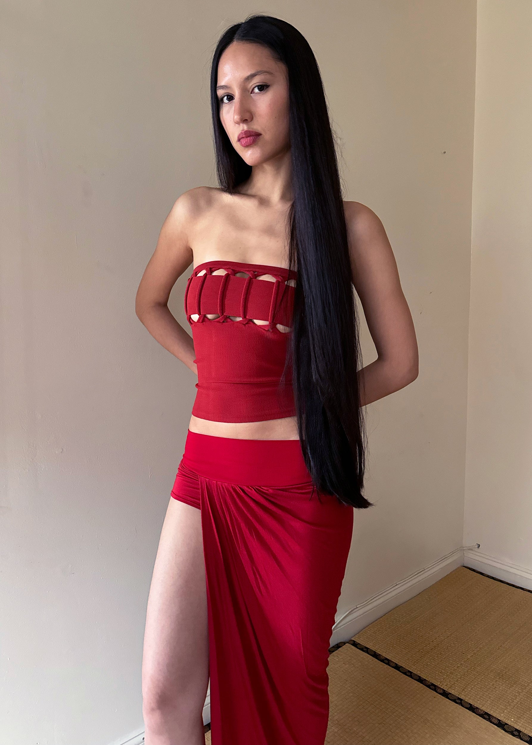 Strapless tube top with signature Shawna Wu knotted knit technique in body hugging compact stretch viscose nylon material. Fully fashioned knitwear with zero waste <3