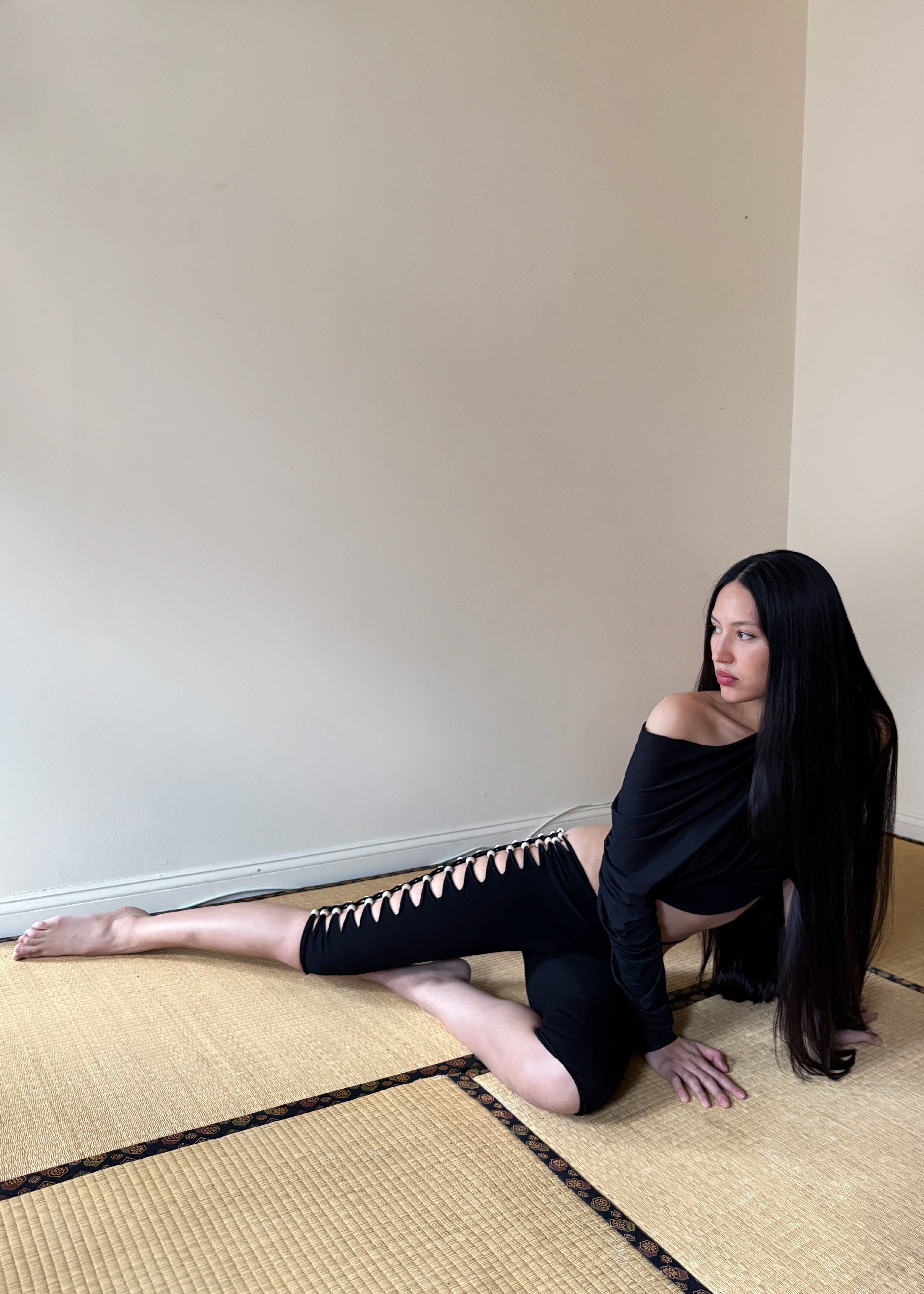 Intricately beaded capris with an adjustable waist strap. Made from an extremely comfortable, soft stretch fabric with integral intarsia slits hand looped with extremely rare beads sourced from Nepal.