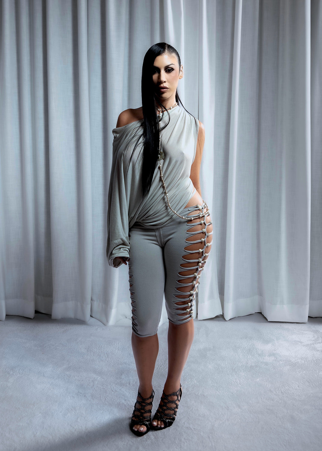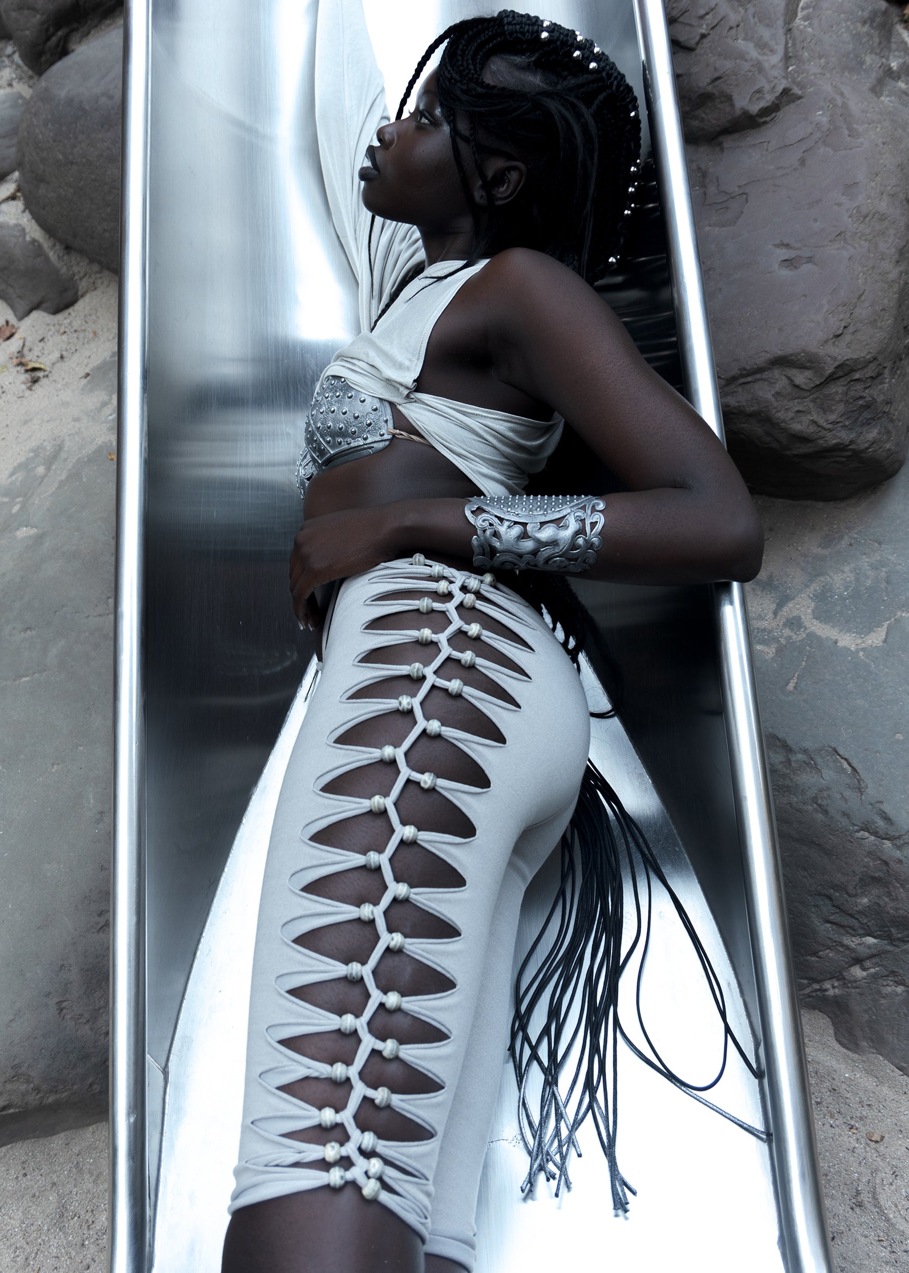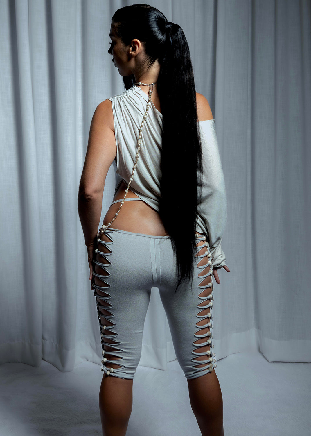 Intricately beaded capris with an adjustable waist strap. Made from an extremely comfortable, soft stretch fabric with integral intarsia slits hand looped with extremely rare beads sourced from Asia. Very limited quantities made <3