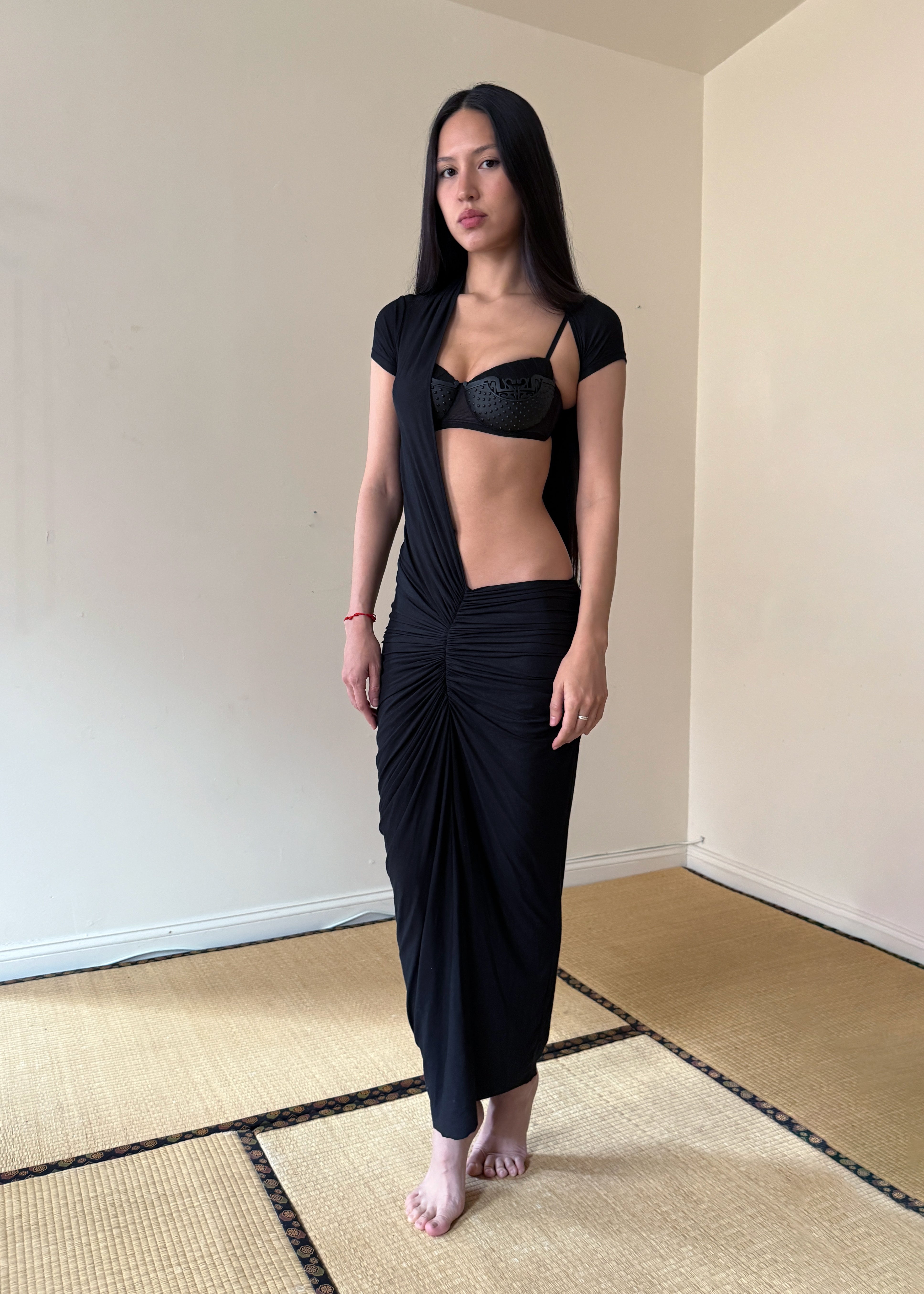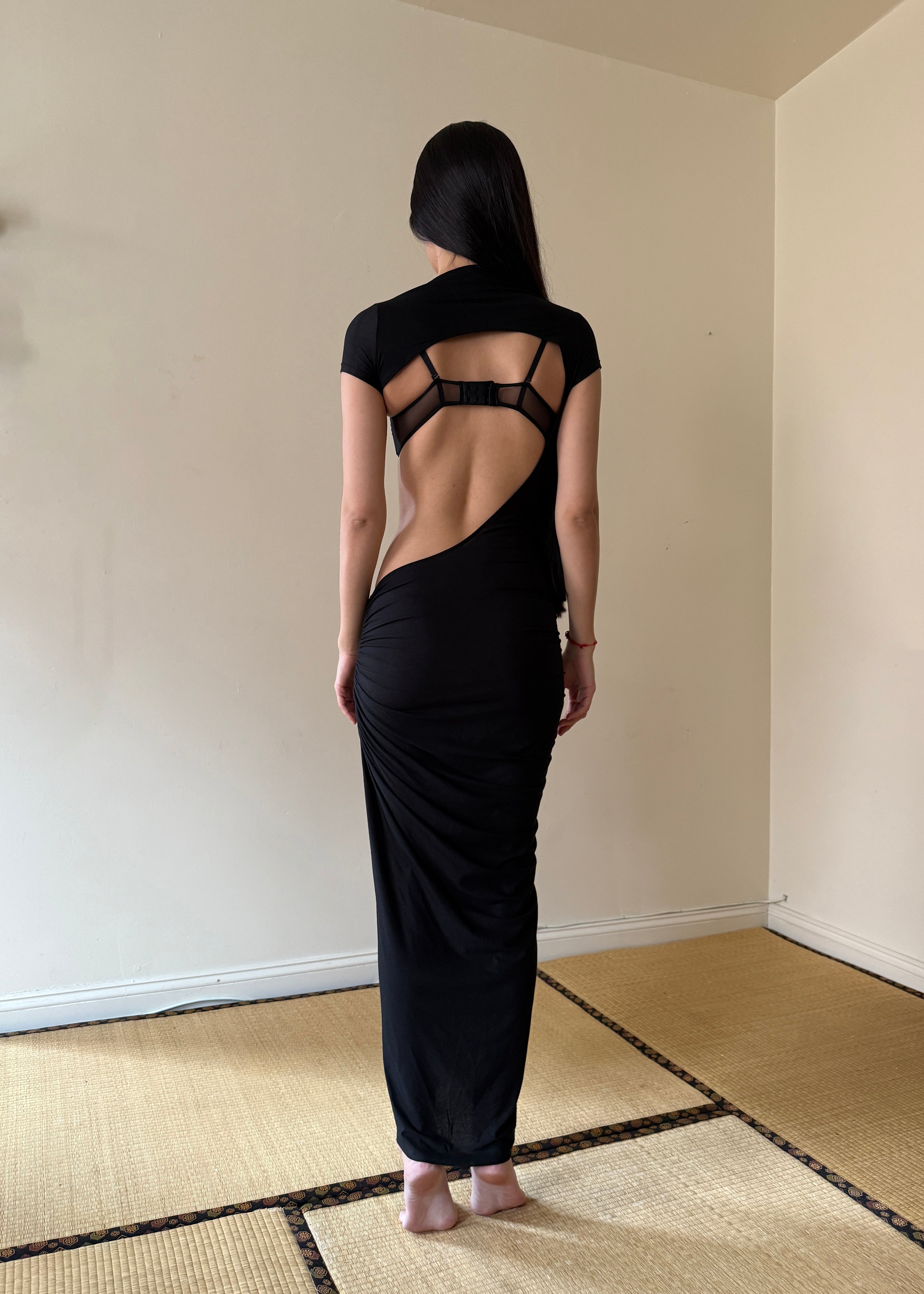 Striking open torso dress with hand gathered details. Featuring a continuously draped asymmetric neckline, scooped open back and cap sleeves. Made in an easy, comfortable stretch fabric.